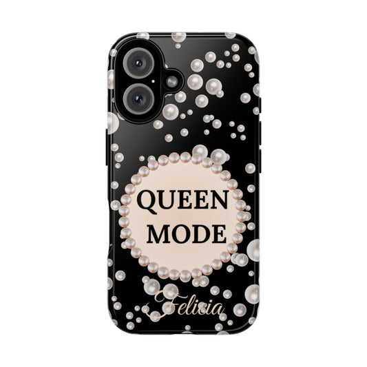 Personalized Queen Mode Themed Tough iPhone Cases 14/15/16 Plus/Pro/Pro Max (Black and Pearl Emblem)