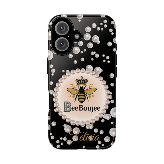 Personalized Bee Boujee Themed Tough iPhone Cases 14/15/16 Plus/Pro/Pro Max (Black and Pearl Emblem)