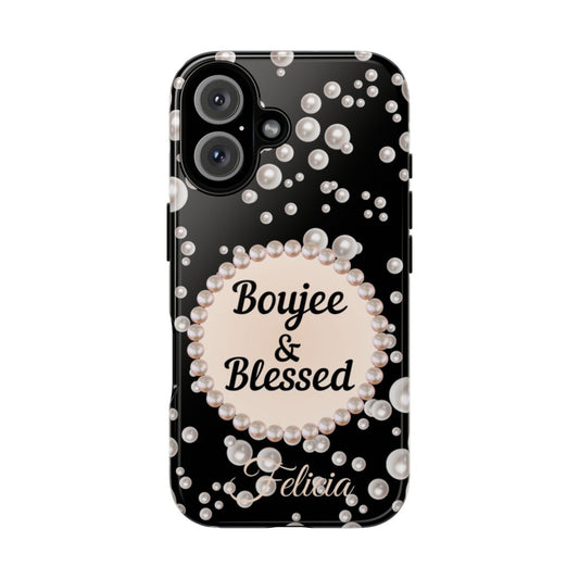 Personalized Boujee & Blessed Themed Tough iPhone Cases 14/15/16 Plus/Pro/Pro Max (Black and Pearl Emblem)