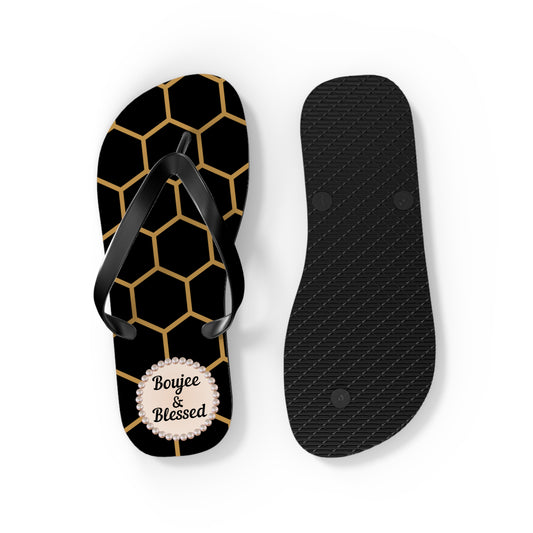 Boujee & Blessed Crowned-Bee Flip-Flops (BLACK/Golden Honeycomb) - SMALL