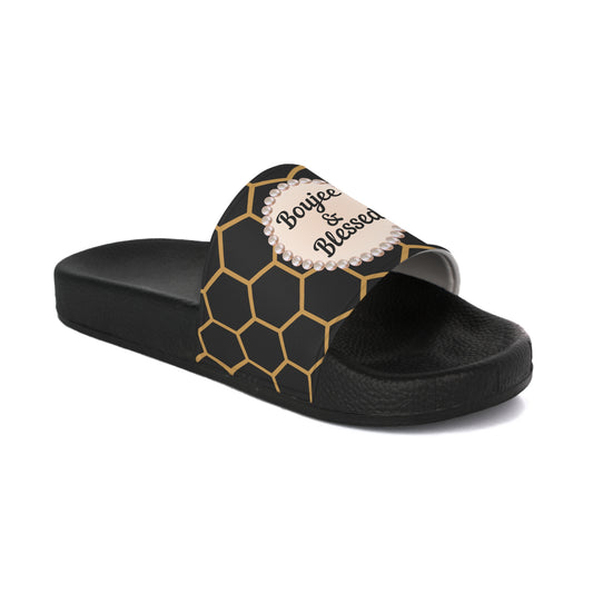 Boujee & Blessed Golden Honeycomb Pearl-Emblem Women’s Slides Sandals