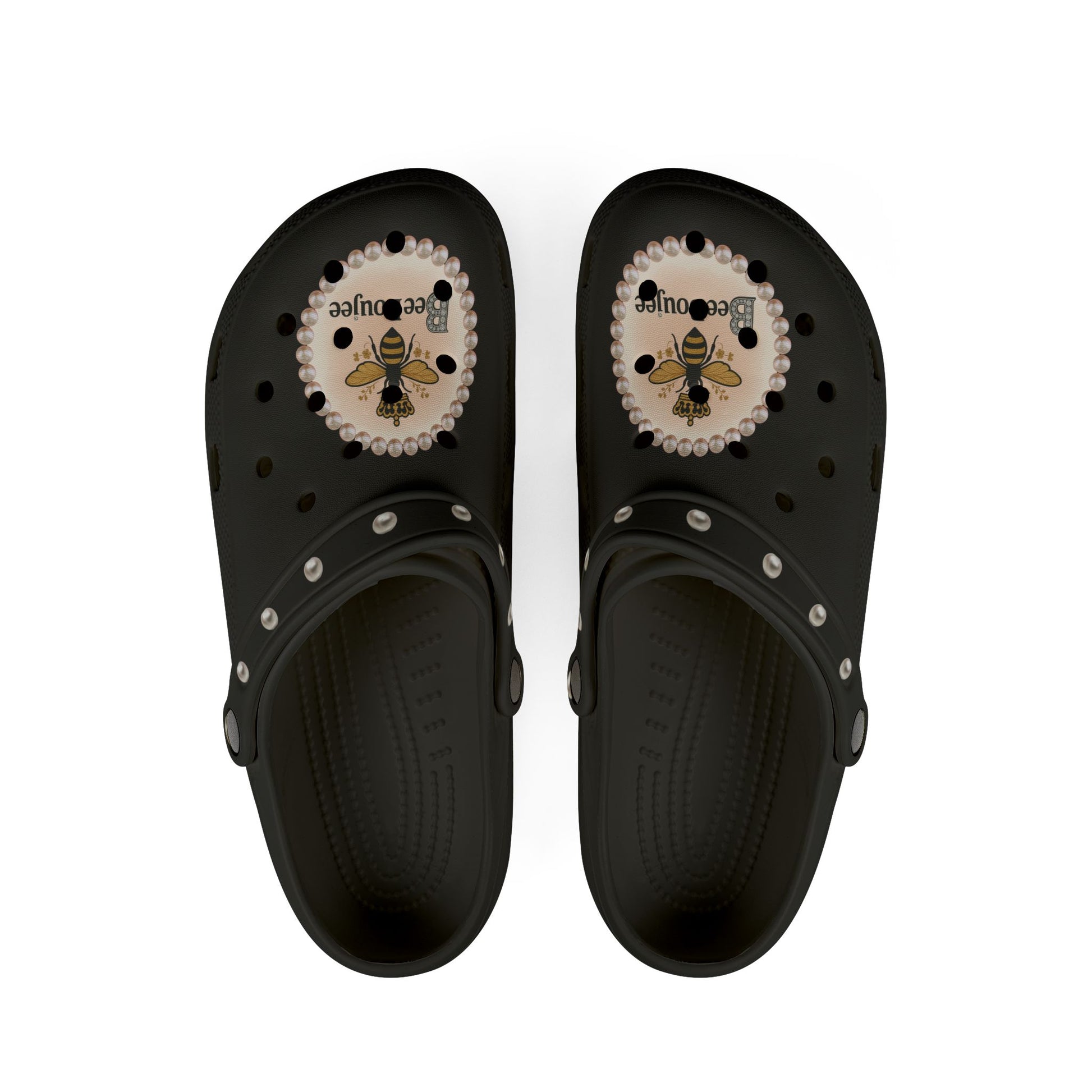 Slip into cushy, statement-making comfort with our Bee Boujee Black Clogs. The all-over black-and-gold honeycomb print frames our pearl-accent crowned bee for a playful, luxe vibe that works indoors or out—errands, garden time, beach days, or just lounging. Lightweight, water-friendly, and easy to clean, these clogs bring boujee flair without sacrificing comfort. Each pair arrives with fun clog accessory charms for an extra pop of personality.
