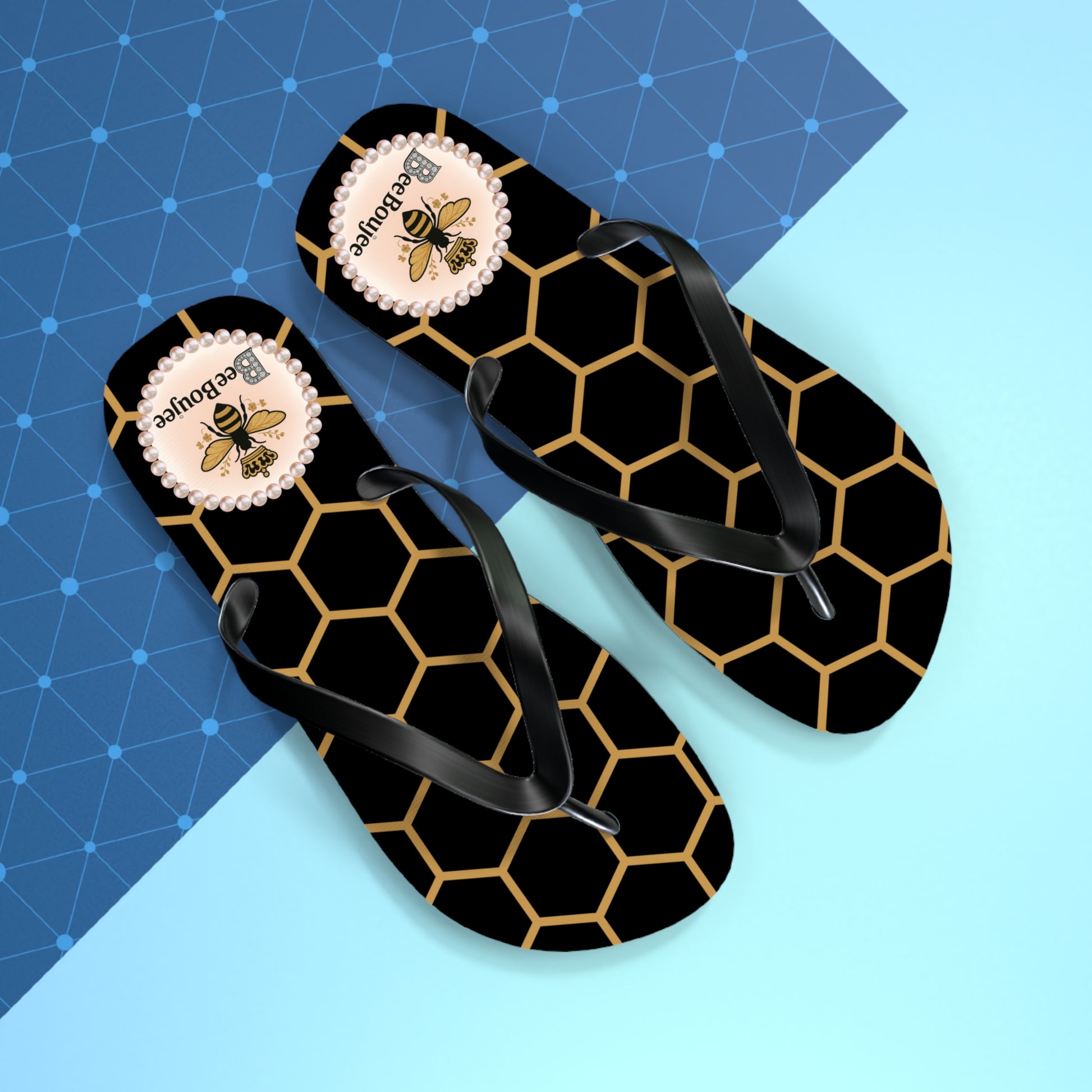 Bee Boujee Flip Flops - BLACK Golden Honeycomb - LARGE