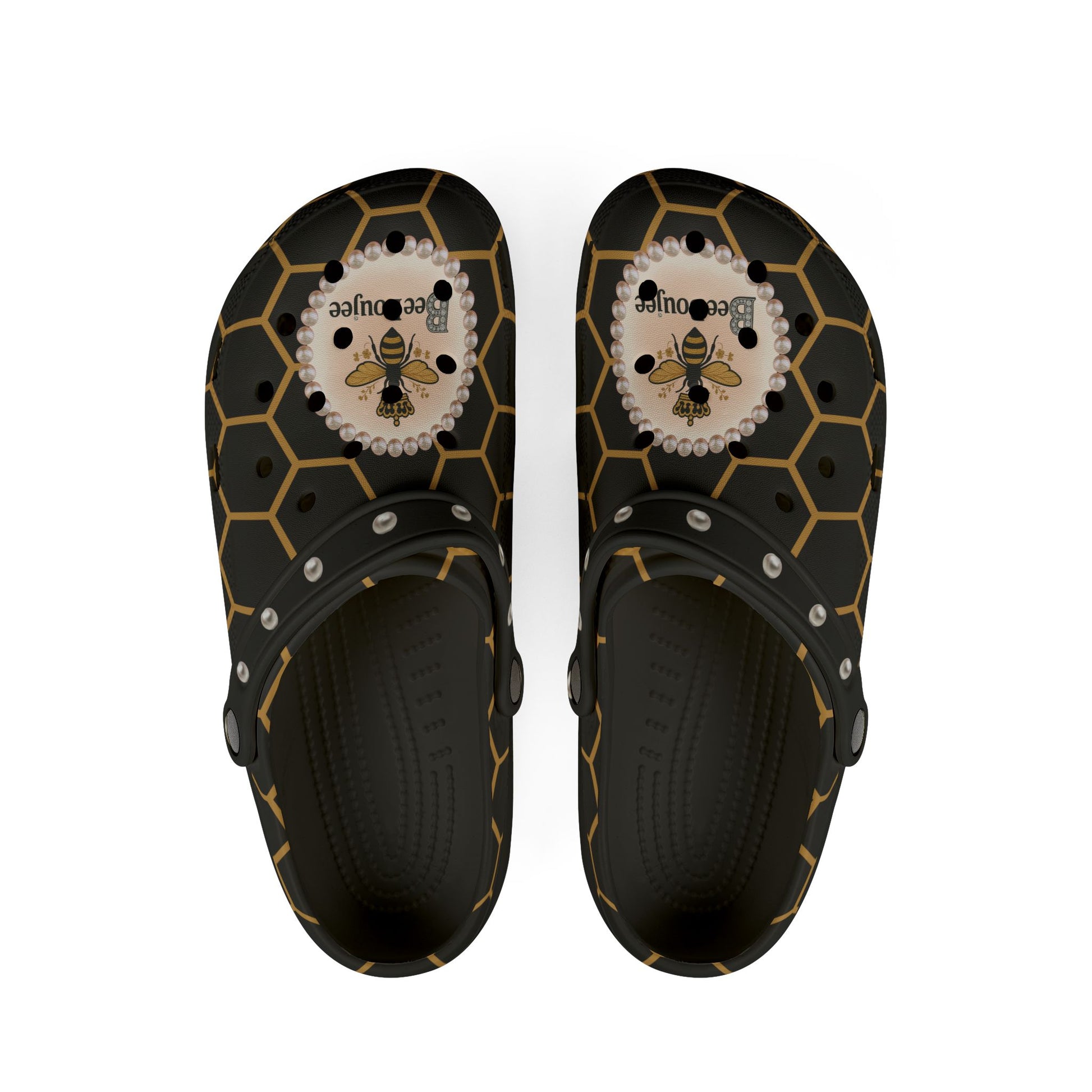Slip into cushy, statement-making comfort with our Bee Boujee Golden Honeycomb Clogs. The all-over black-and-golden honeycomb print frames our pearl-accent crowned bee for a playful, luxe vibe that works indoors or out—errands, garden time, beach days, or just lounging. Lightweight, water-friendly, and easy to clean, these clogs bring boujee flair without sacrificing comfort. Each pair arrives with fun clog accessory charms for an extra pop of personality.