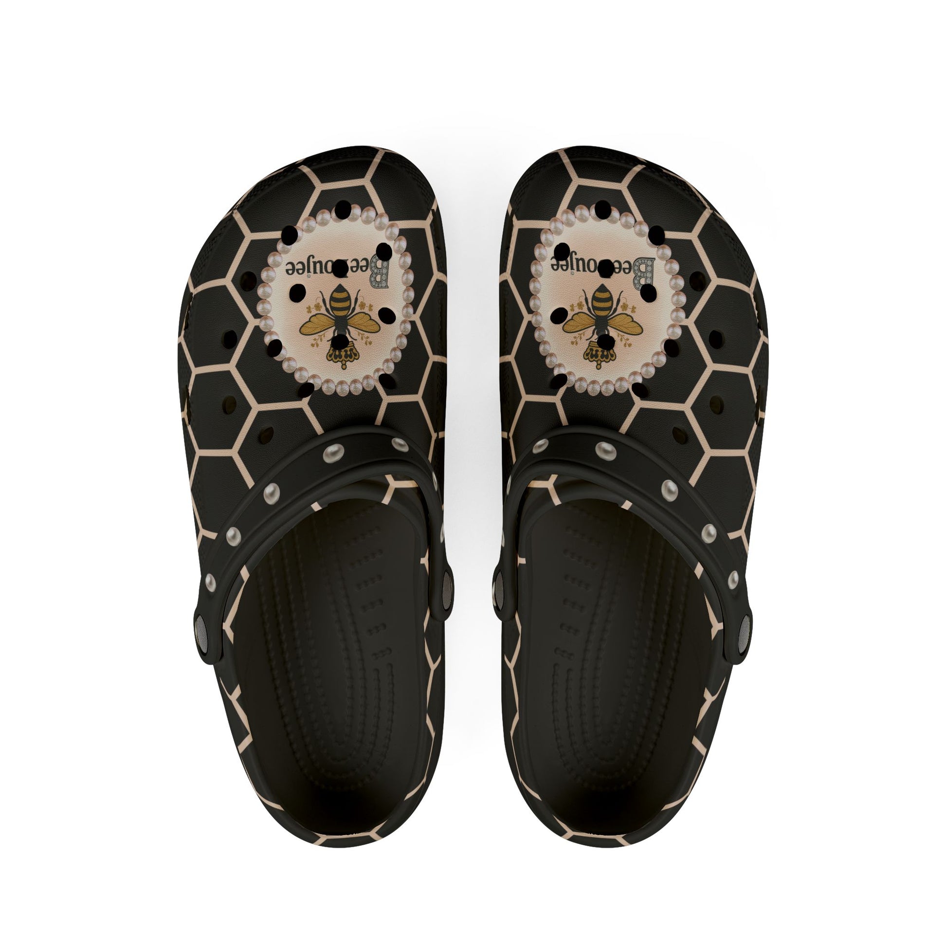 Slip into cushy, statement-making comfort with our Bee Boujee Peach Honeycomb Clogs. The all-over black-and-gold honeycomb print frames our pearl-accent crowned bee for a playful, luxe vibe that works indoors or out—errands, garden time, beach days, or just lounging. Lightweight, water-friendly, and easy to clean, these clogs bring boujee flair without sacrificing comfort. Each pair arrives with fun clog accessory charms for an extra pop of personality.
