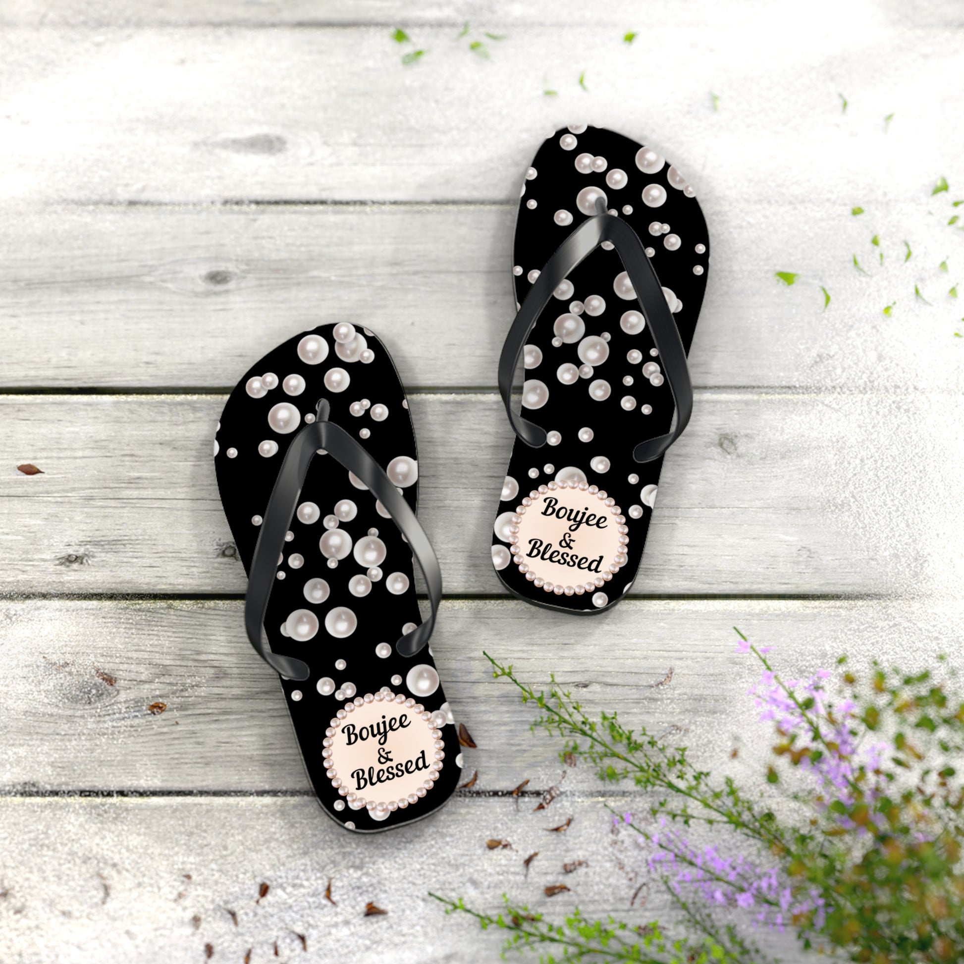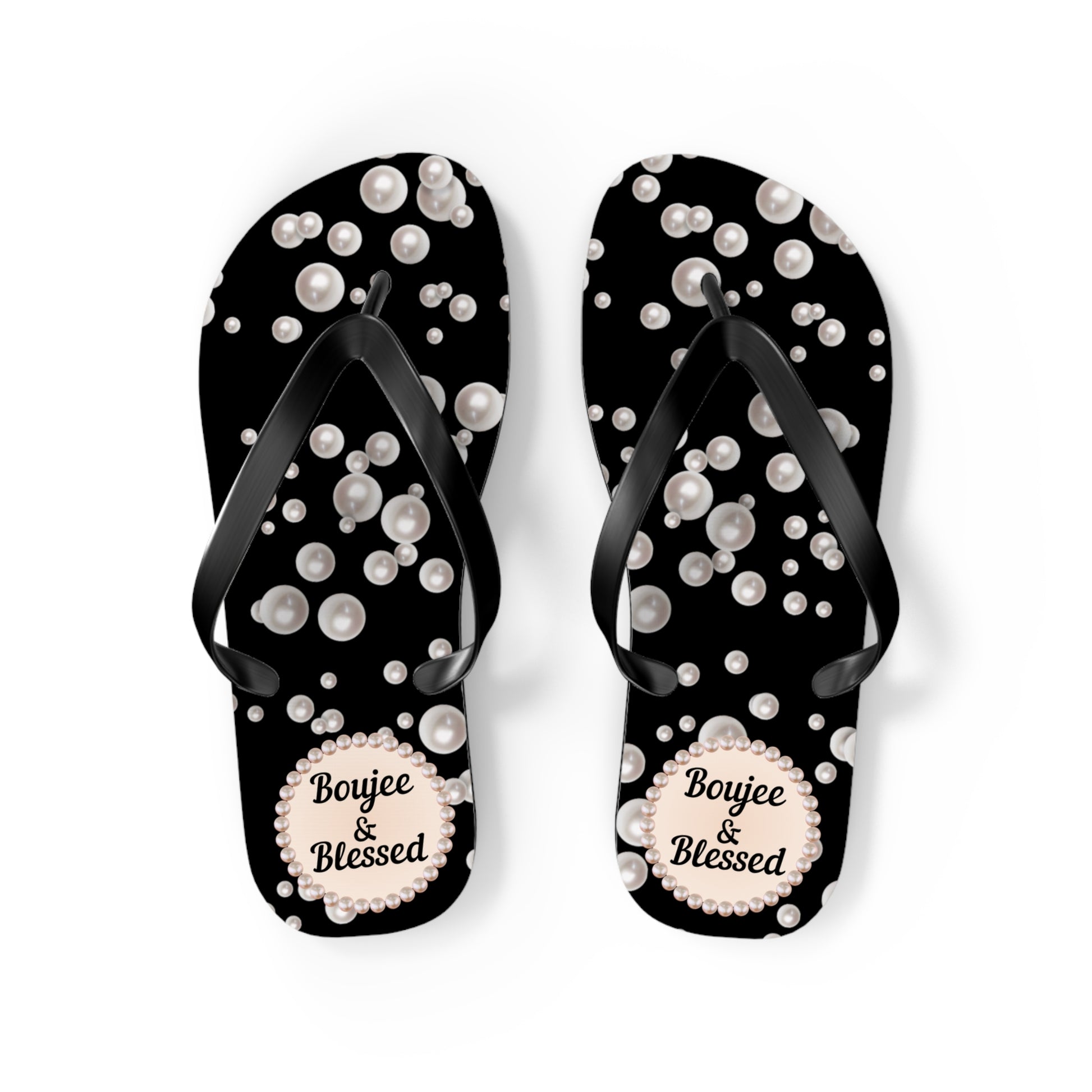 Boujee & Blessed Flip Flops - BLACK in Sea of Pearls - MEDIUM