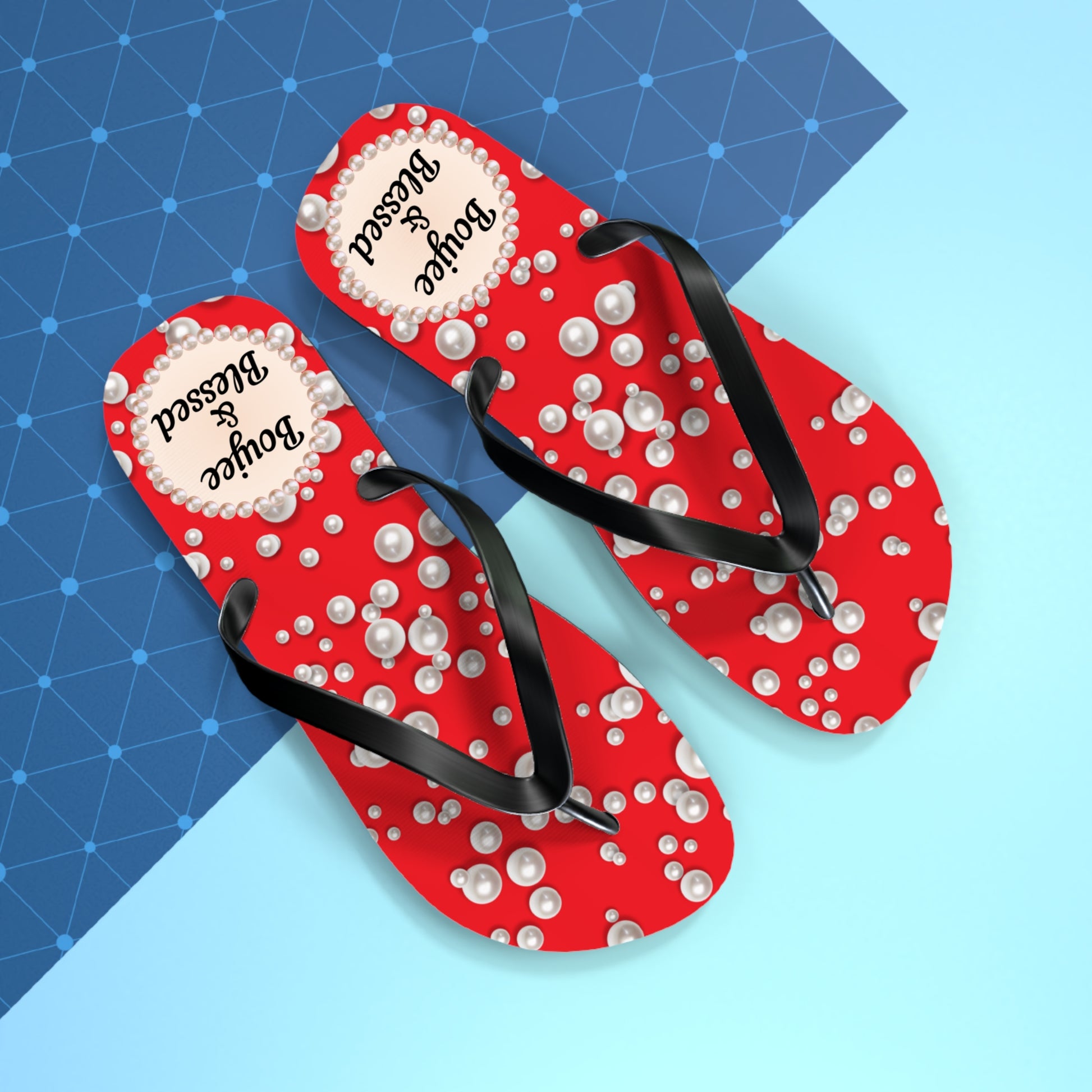 Boujee & Blessed Flip Flops - RED in Sea of Pearls - LARGE
