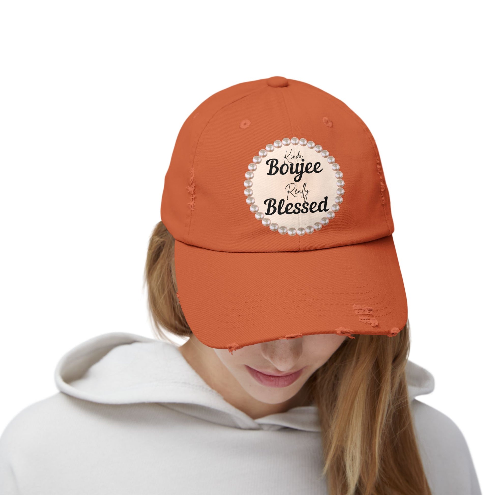 Top off any look with our Kinda Boujee Really Blessed Distressed Pearl-Emblem Cap, where vintage vibes meet boujee charm. Crafted from soft, garment-washed cotton twill, this hat features intentional distressing for lived-in character and an eye-catching pearl-framed Kinda Boujee Really Blessed crest front-and-center. An adjustable metal buckle strap ensures a custom fit, while the pre-curved brim keeps the sun at bay. Effortlessly versatile—pair it with jeans, shorts, athleisure or a cute dress—this cap brings a laid-back yet luxe edge to beach days, brunch runs, festivals, relaxed gatherings and beyond. A perfect gift for anyone who loves relaxed style with a touch of glam. This cap is ideal for those who appreciate personality in their wardrobe, as it appeals to fashion-forward individuals looking for a standout piece. Celebrate holidays, birthdays, or just a sunny day with this versatile cap, making it a thoughtful gift for friends and family who value unique boujee fashion.