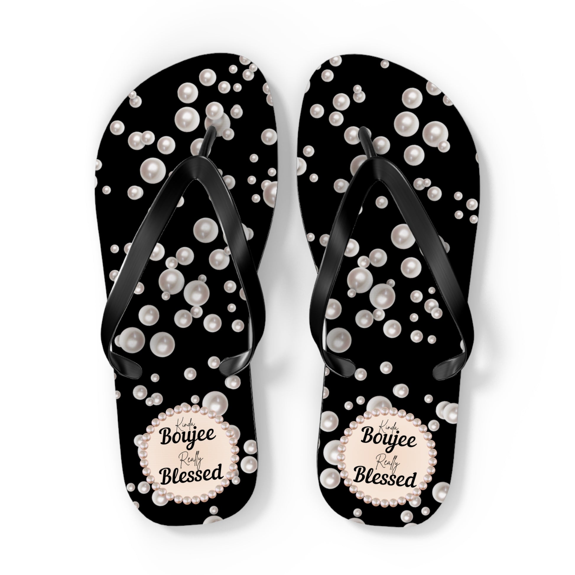 Kinda Boujee Really Blessed Flip Flops - BLACK in Sea of Pearls - EXTRA LARGE