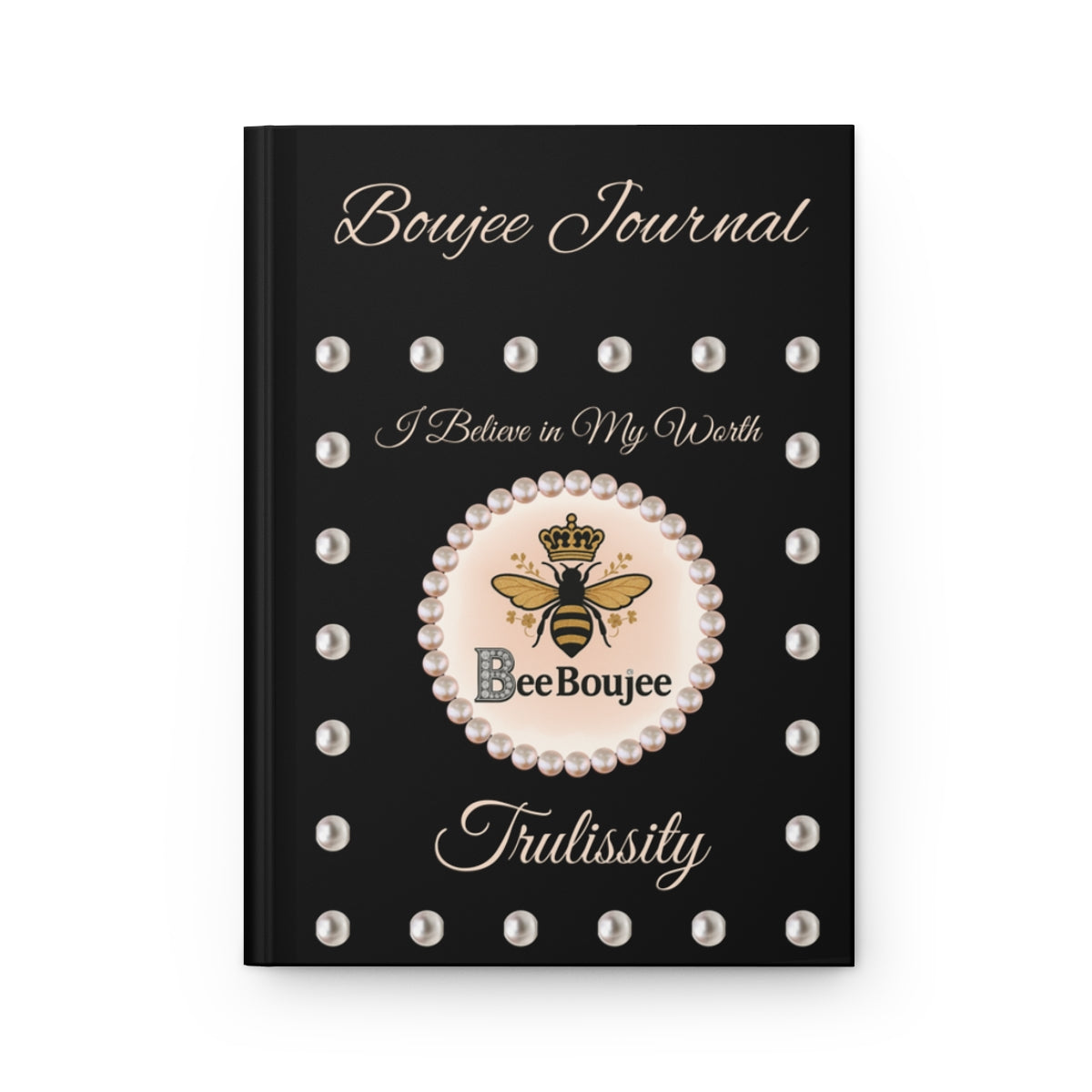 Personalized Name & Daily Mantra – custom name & daily affirmation (“I Believe in My Worth,”) elegantly scripted on the cover alongside the iconic Pearl-framed Bee Boujee crest.