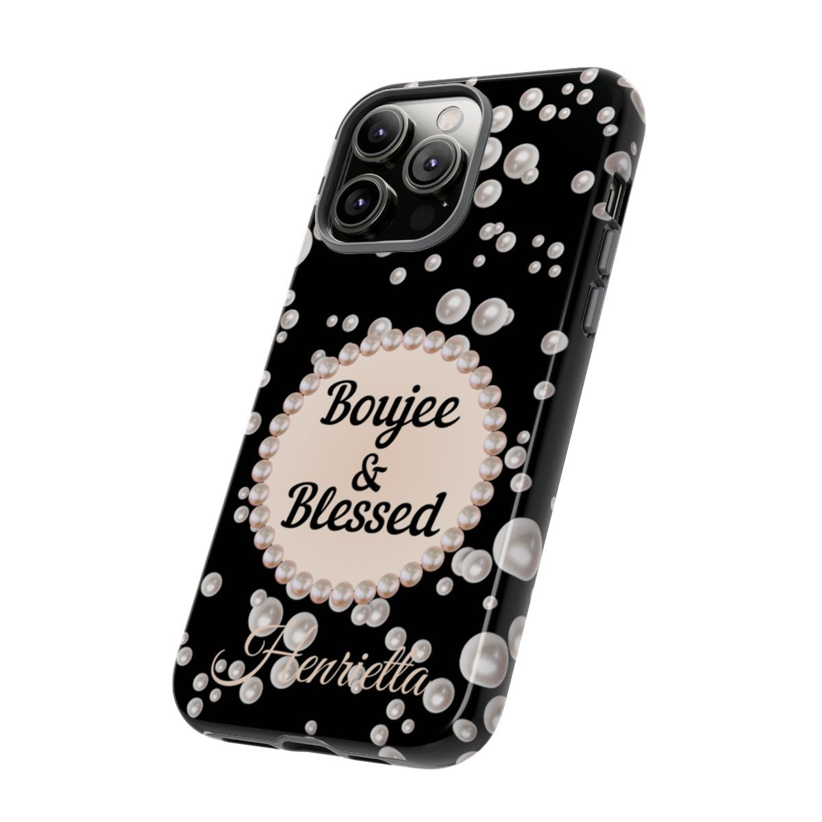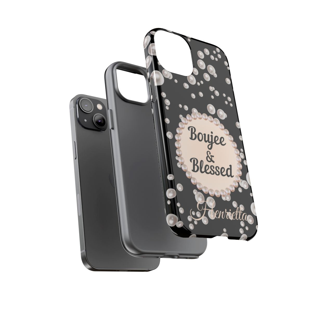 Personalized Boujee & Blessed Themed Tough iPhone Cases 14/15/16 Plus/Pro/Pro Max (Black and Pearl Emblem)