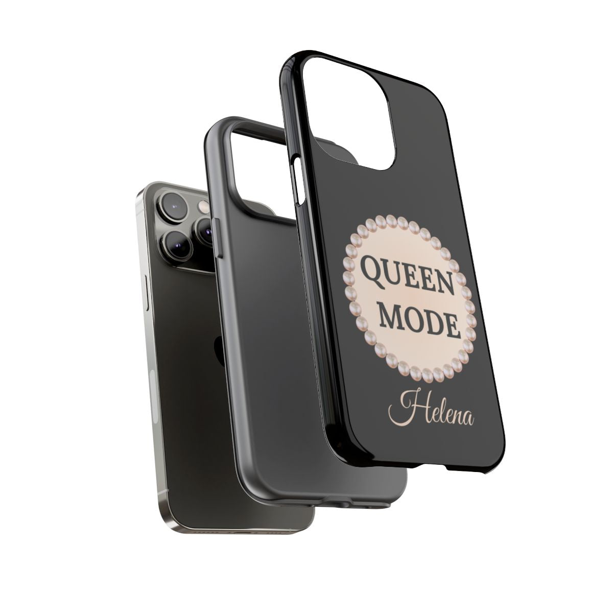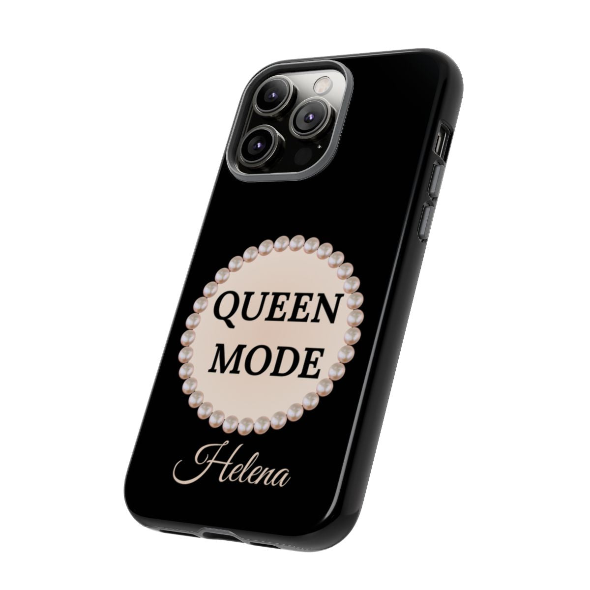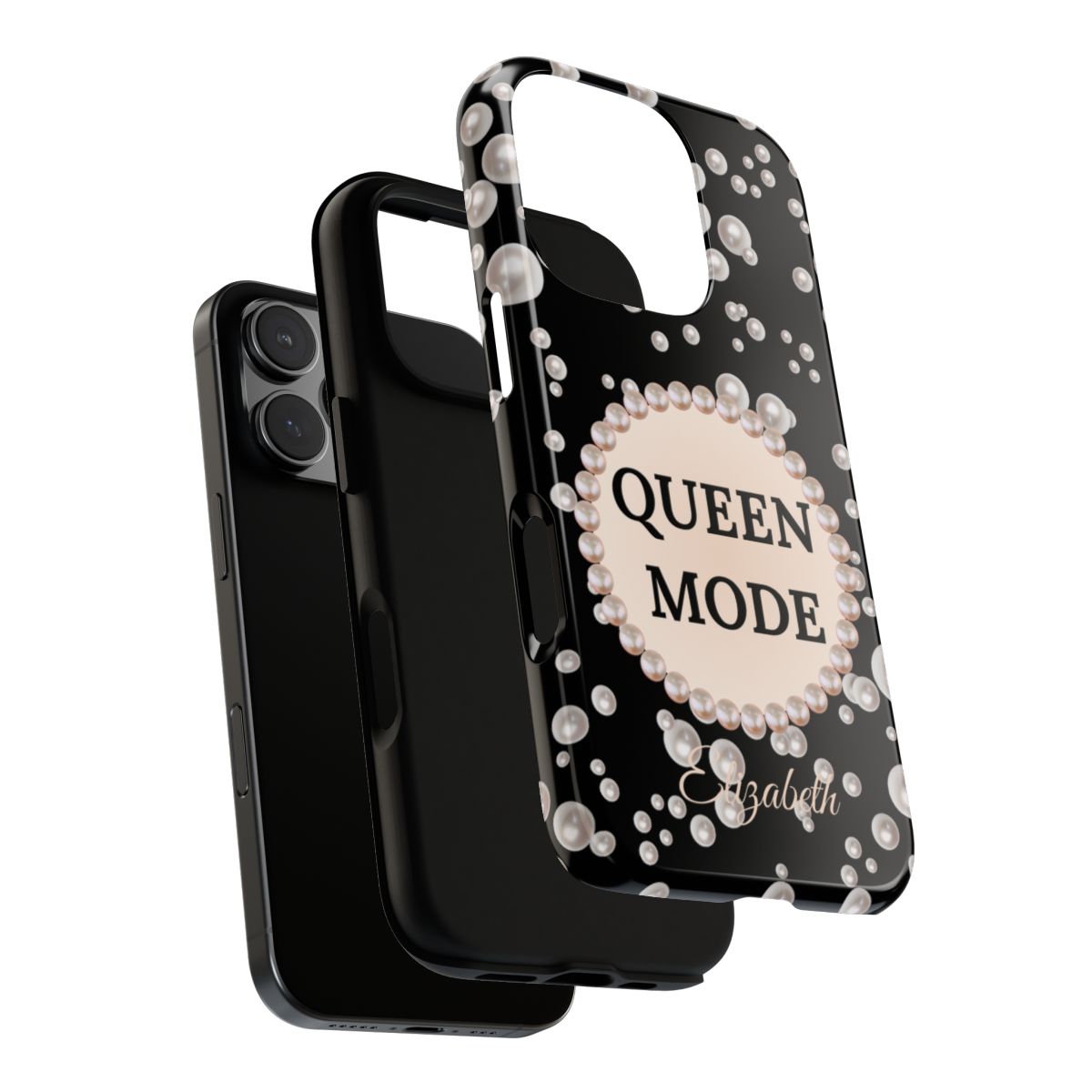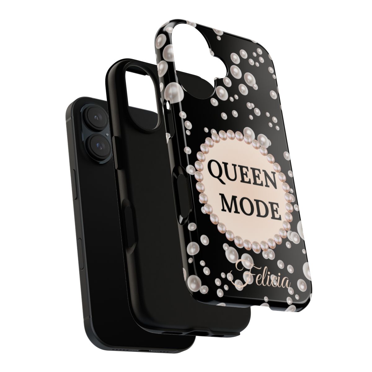 Dress your phone in luxury protection. These Queen Mode themed cases for 16 Plus, feature sleek Black pearl-frame and signature pearl-framed in a sea of pearls and your name in elegant script—printed in crisp, high-gloss color. Built for everyday bumps and luxurious nights out, it keeps your iPhone stylish and safe.