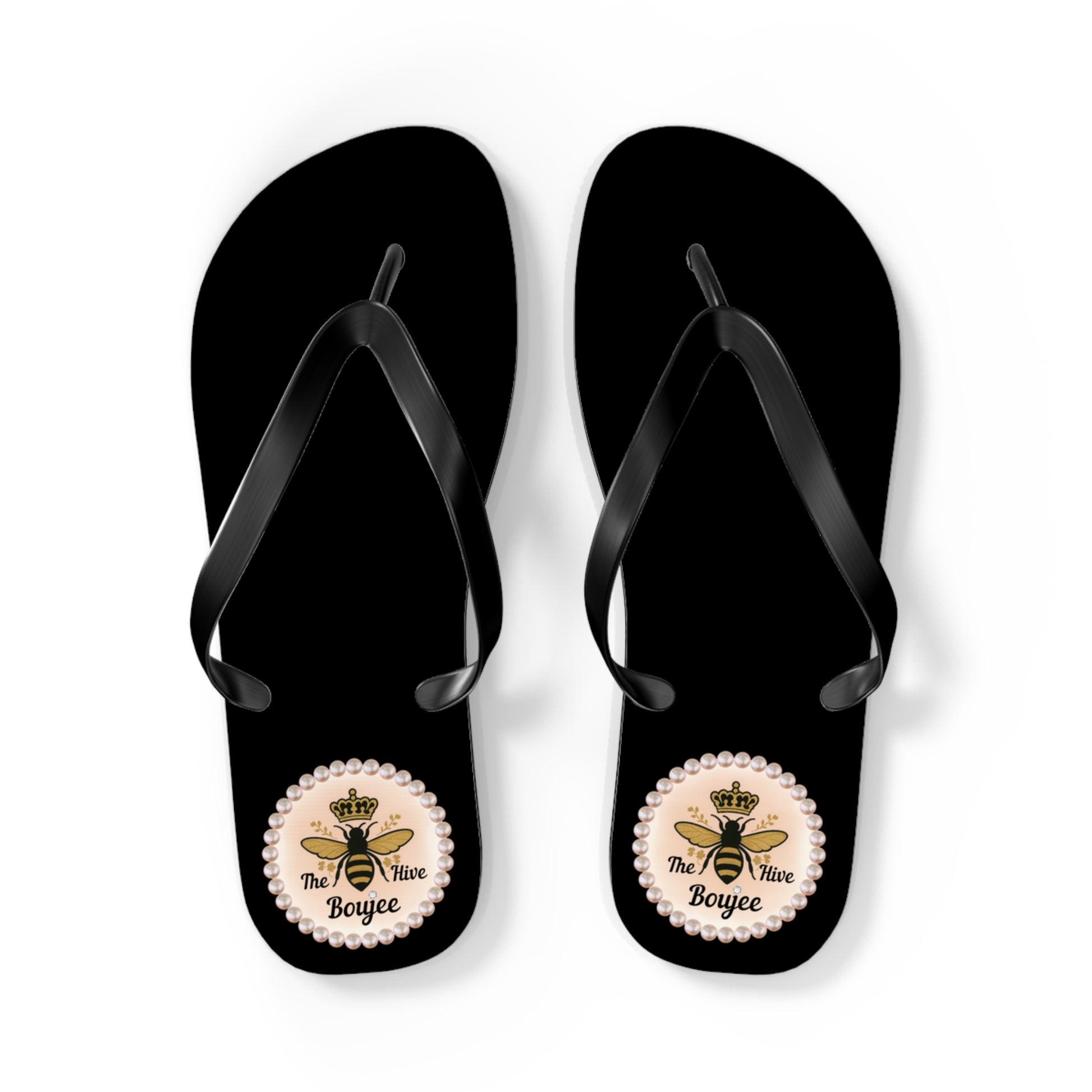 Make waves in luxe style. These Boujee Hive flip-flops feature a sleek black footbed with our Boujee Hive crowned-bee medallion at the heel —glam from beach to brunch.