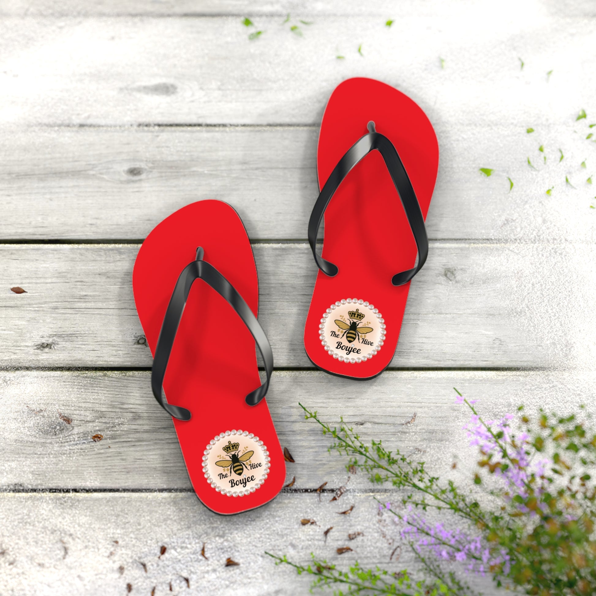 Make waves in luxe style. These Boujee Hive flip-flops feature a sleek red footbed with our "The Boujee Hive" crowned-bee medallion at the heel —glam from beach to brunch.